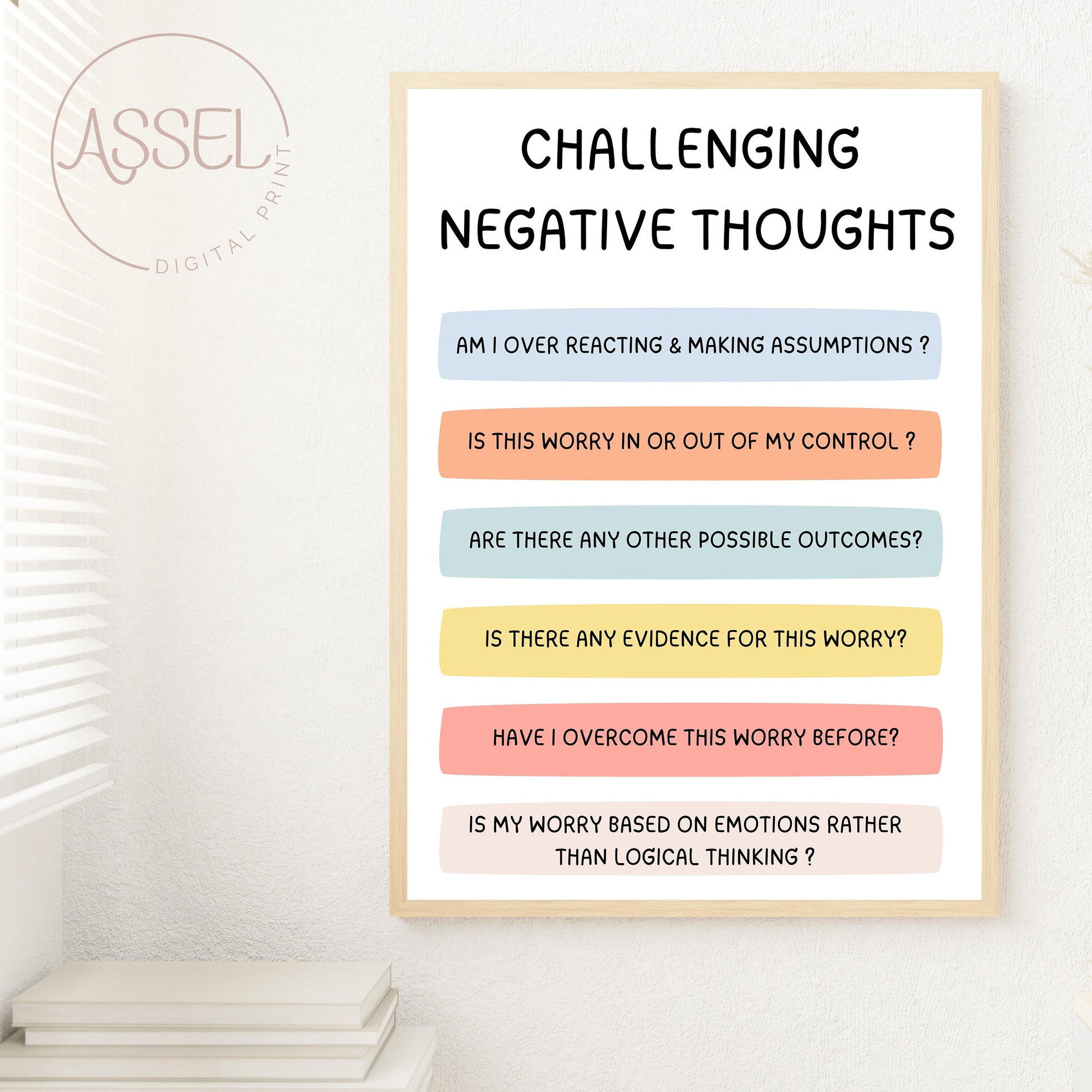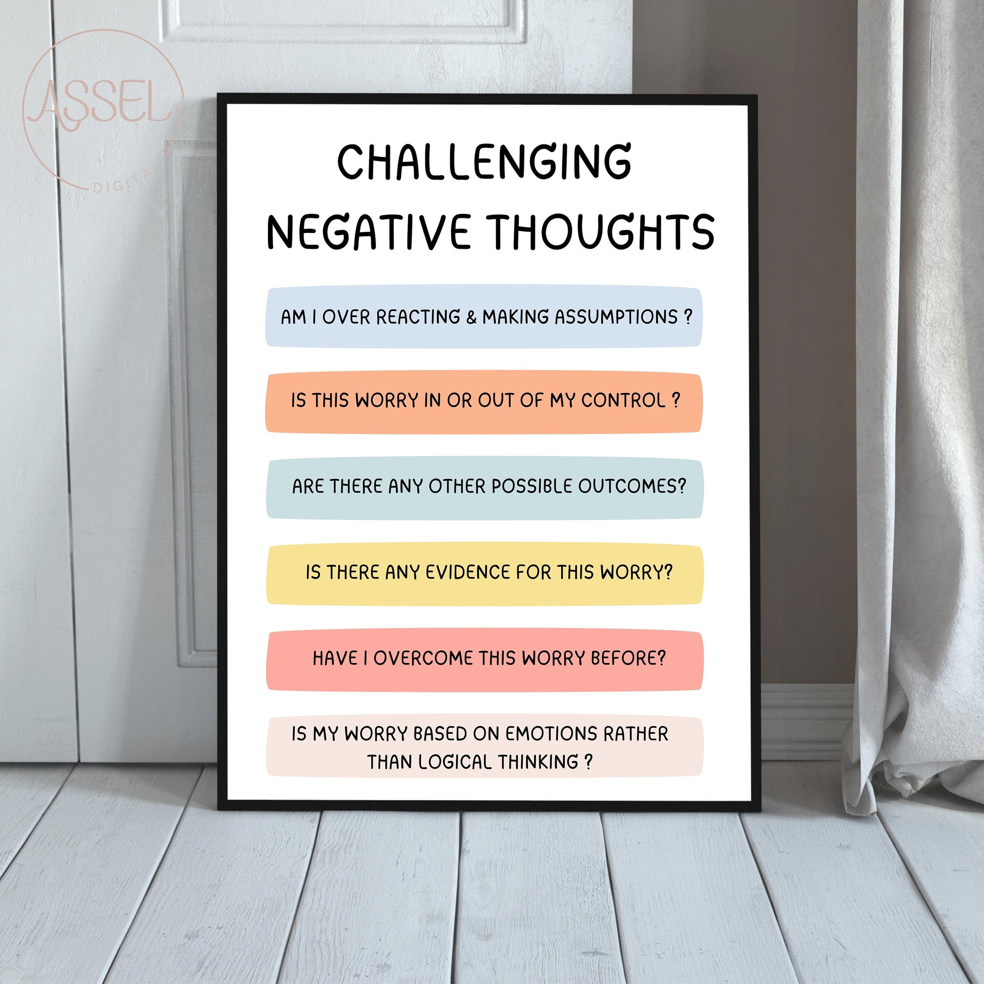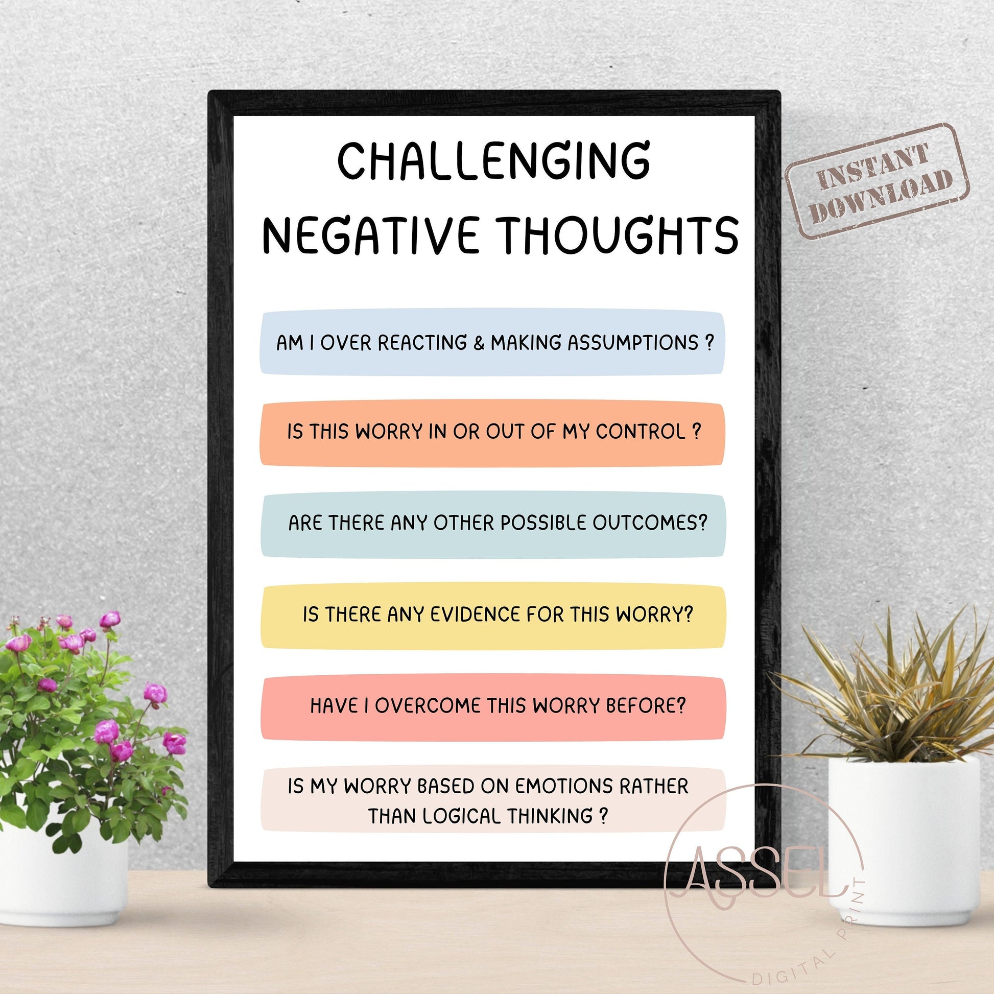Cette affiche de lutte contre les pensées négatives est le complément parfait à n'importe quel espace de bureau, en particulier pour ceux qui travaillent dans le domaine de la santé mentale. L'affiche présente un design esthétique et énumère des questions utiles sur la thérapie cognitivo-comportementale (TCC) qui visent à aider les gens à identifier et à combattre leurs pensées négatives, ce qui en fait une excellente ressource pour les clients, les thérapeutes et les conseillers.