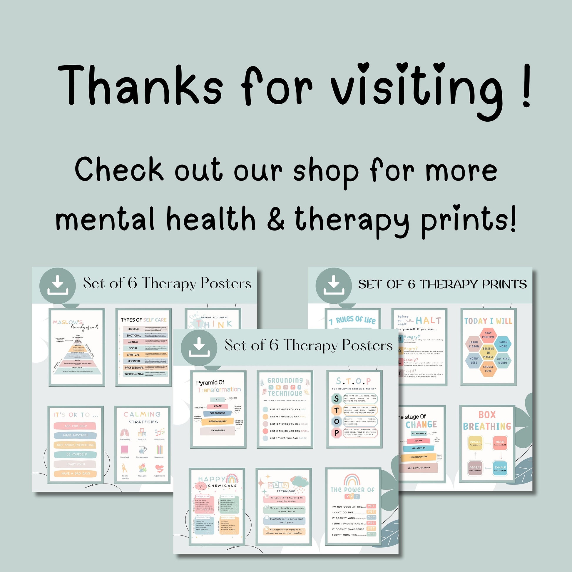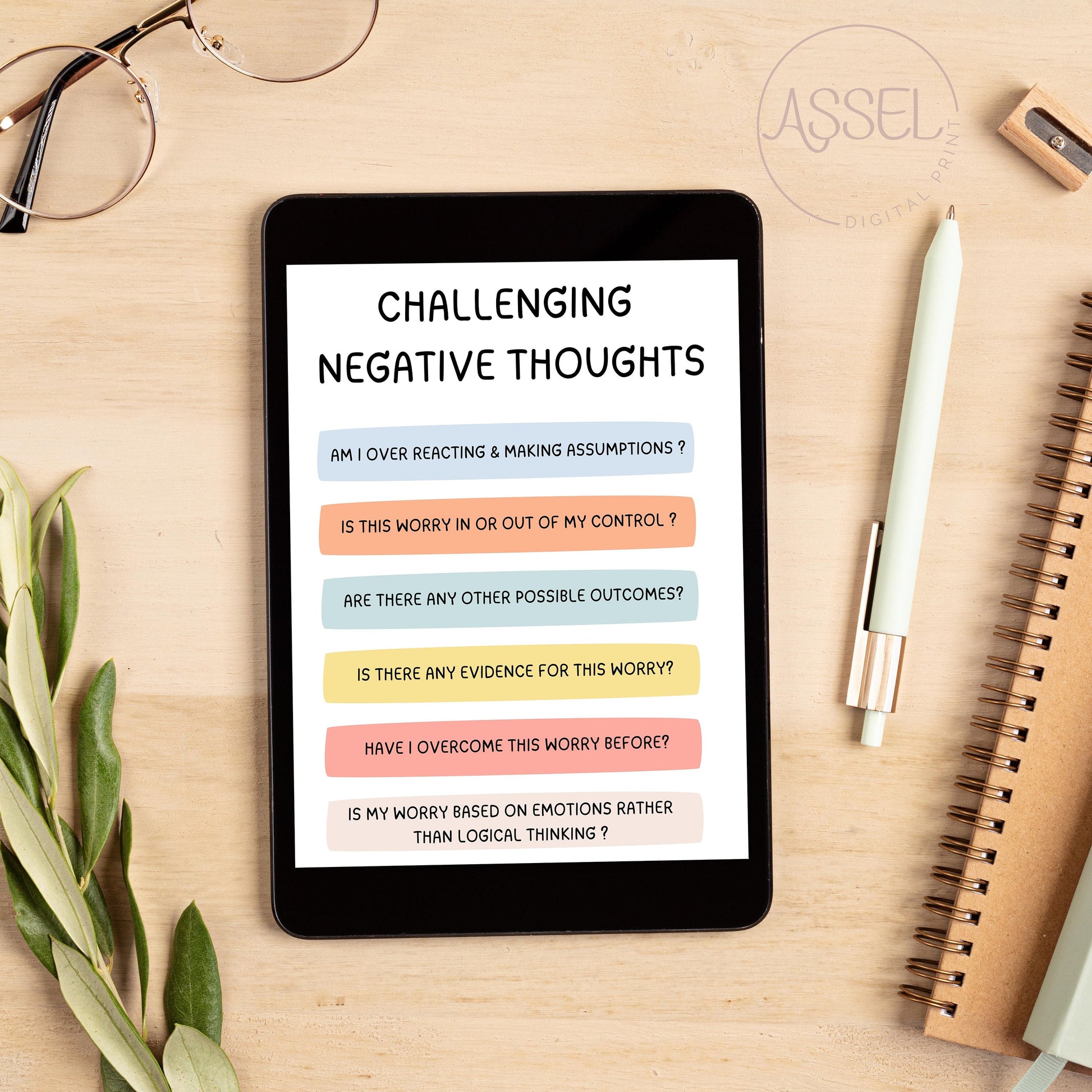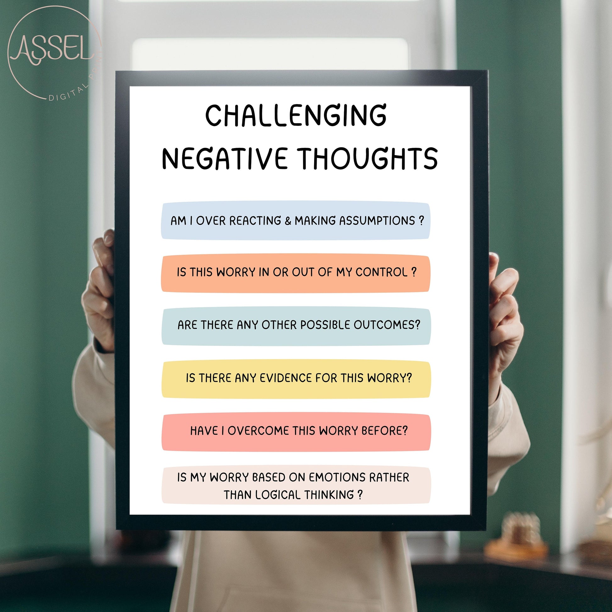 Cette affiche de lutte contre les pensées négatives est le complément parfait à n'importe quel espace de bureau, en particulier pour ceux qui travaillent dans le domaine de la santé mentale. L'affiche présente un design esthétique et énumère des questions utiles sur la thérapie cognitivo-comportementale (TCC) qui visent à aider les gens à identifier et à combattre leurs pensées négatives, ce qui en fait une excellente ressource pour les clients, les thérapeutes et les conseillers.